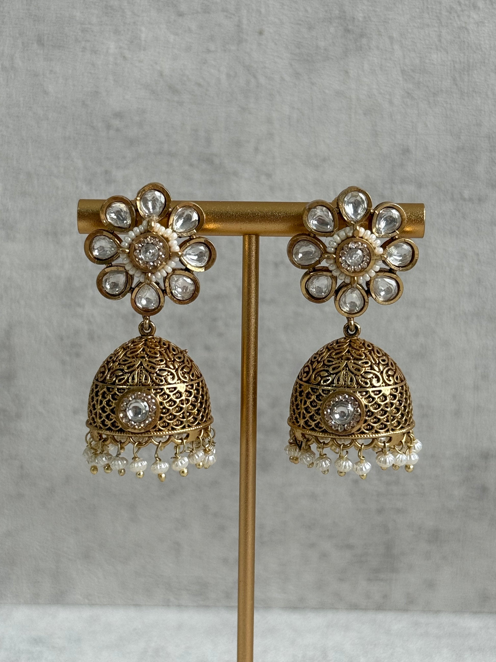 Paired with matching jhumkis featuring kundan floral tops, ruby centres, and pearl fringes, the set exudes refined traditional charm. The detailing on each jhumki showcases delicate craftsmanship — ornate, lightweight, and beautifully balanced for effortless wear.