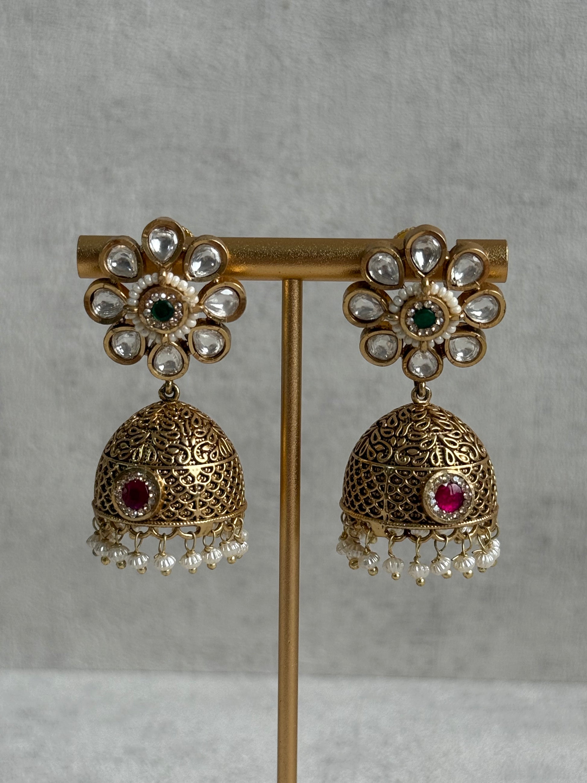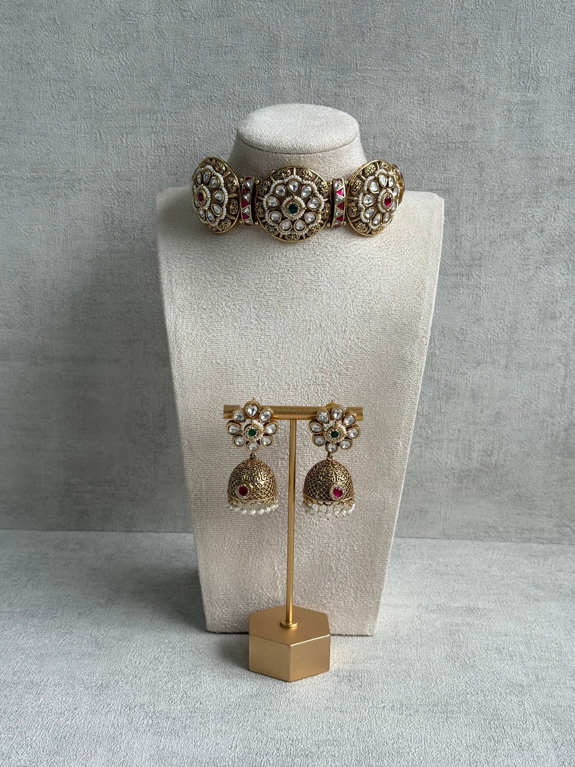 The Ayura Designs Tanu Choker Set – Antique Gold Choker & Jhumkis with Ruby & Emerald Kundan and Pearl Borders embodies regal charm and timeless craftsmanship. Set in an antique gold finish, this design features three bold circular motifs framed with lustrous kundan stones, delicate pearl borders, and fine filigree work that reflects heritage artistry at its best.