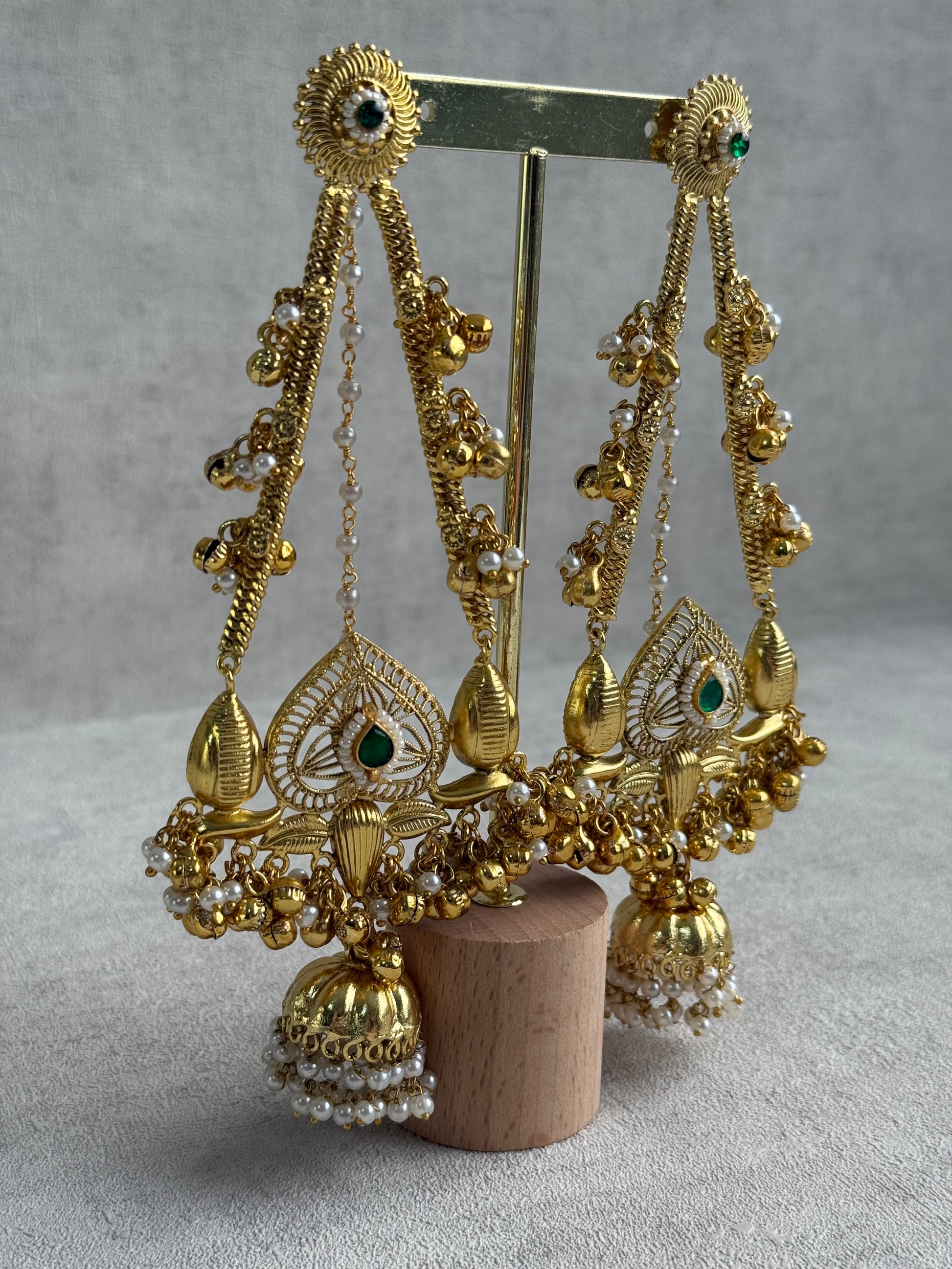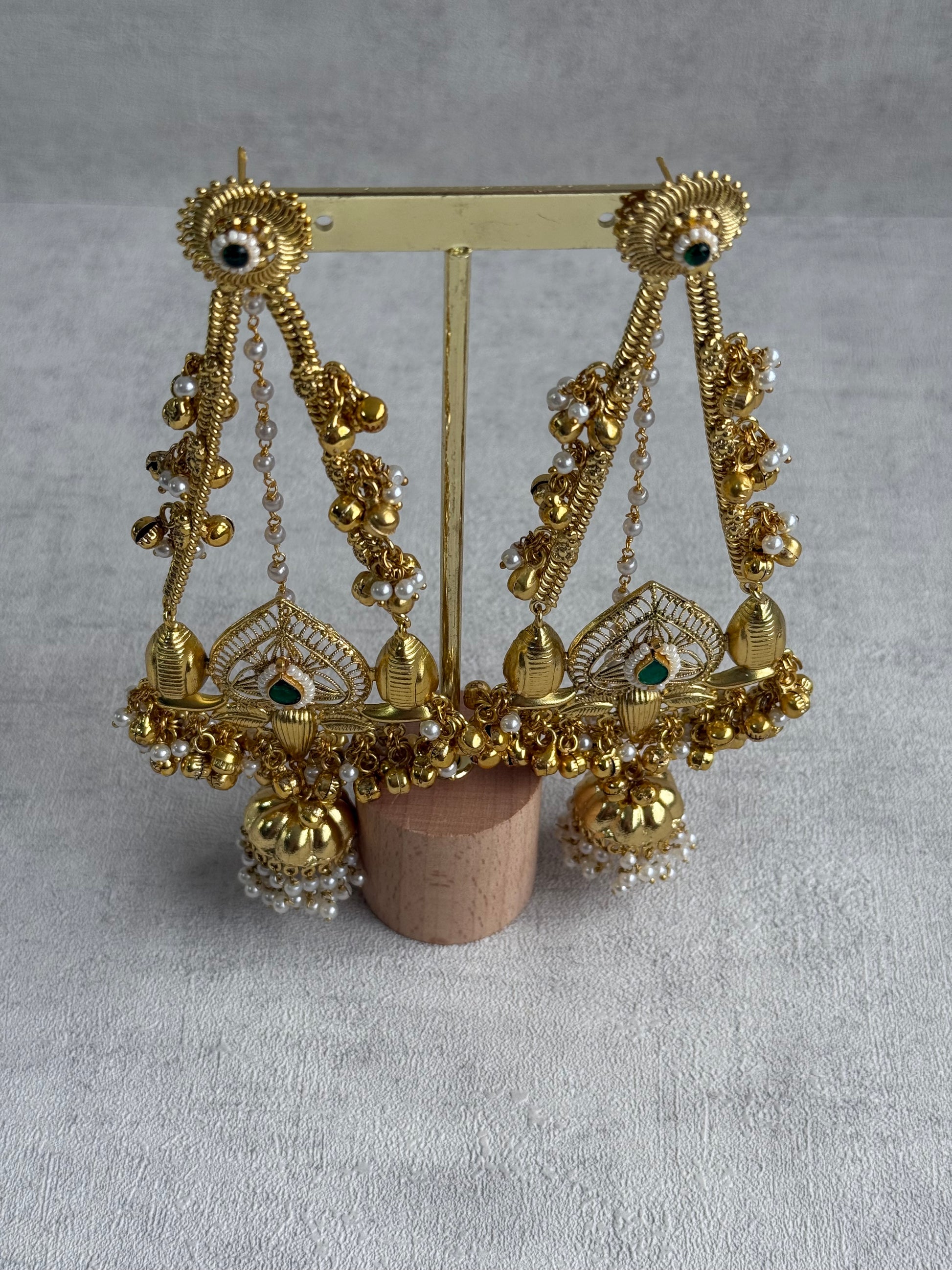 The Ayura Designs Teja Earrings in emerald green bring heritage craftsmanship to life with every intricate curve. Finished in antique gold, these statement jhumkis feature detailed temple-inspired filigree, dainty ghungroos, and cascading pearl strands. At the centre rests a vivid emerald stone, creating a striking contrast that evokes timeless grace.