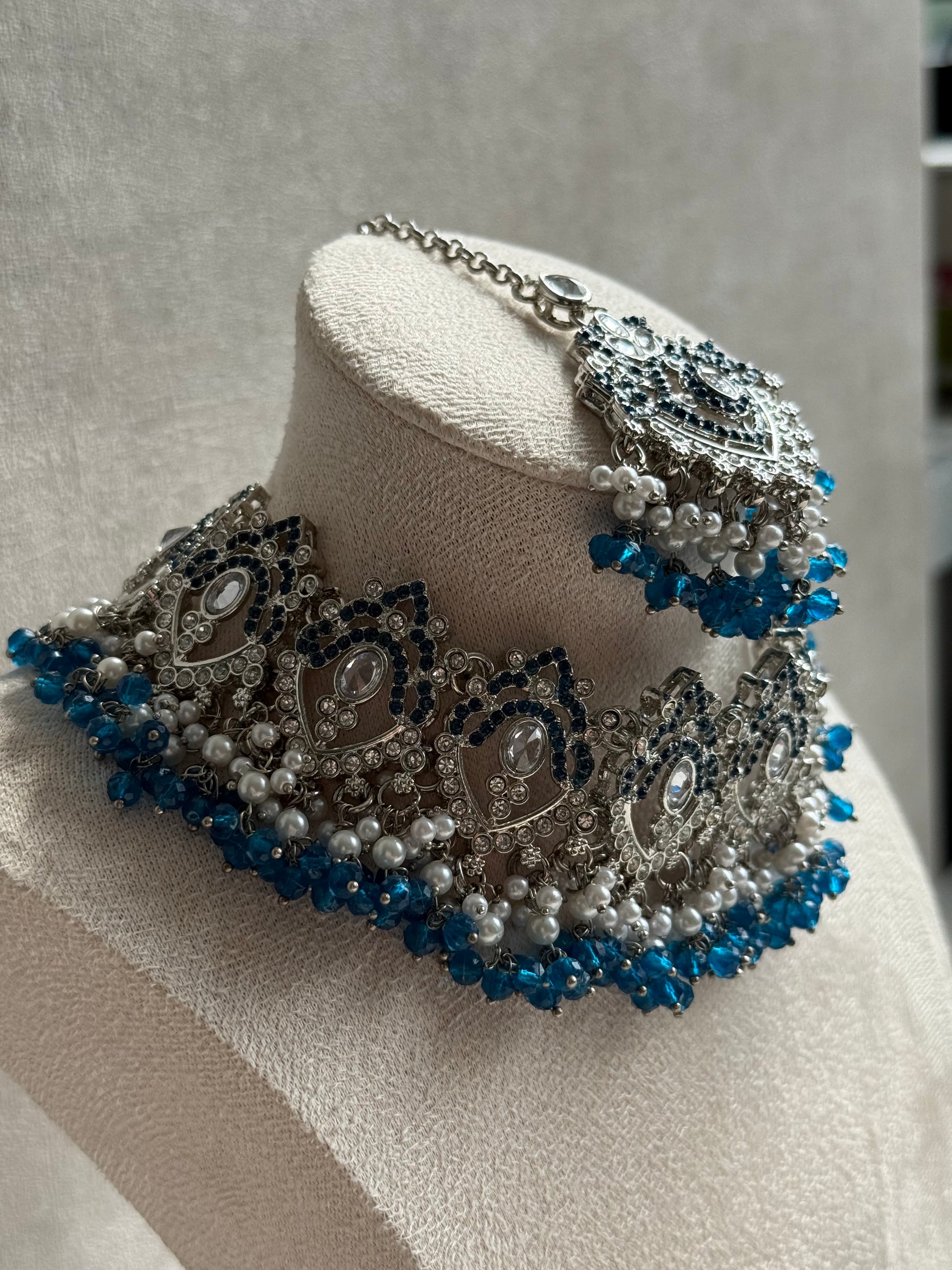 The choker is structured with symmetrical motifs featuring mirror stones nestled within delicate silverwork and framed by pearl clusters and bold fuchsia beads. The matching jhumkis echo this detailing, with layered components that jingle softly and shimmer with movement. The tikka and passa are designed to perfectly balance the set—highlighting your features while adding a graceful asymmetry to the face. Together, this full set creates a strong silhouette for wedding festivities, bridal events, or statement occasions.
