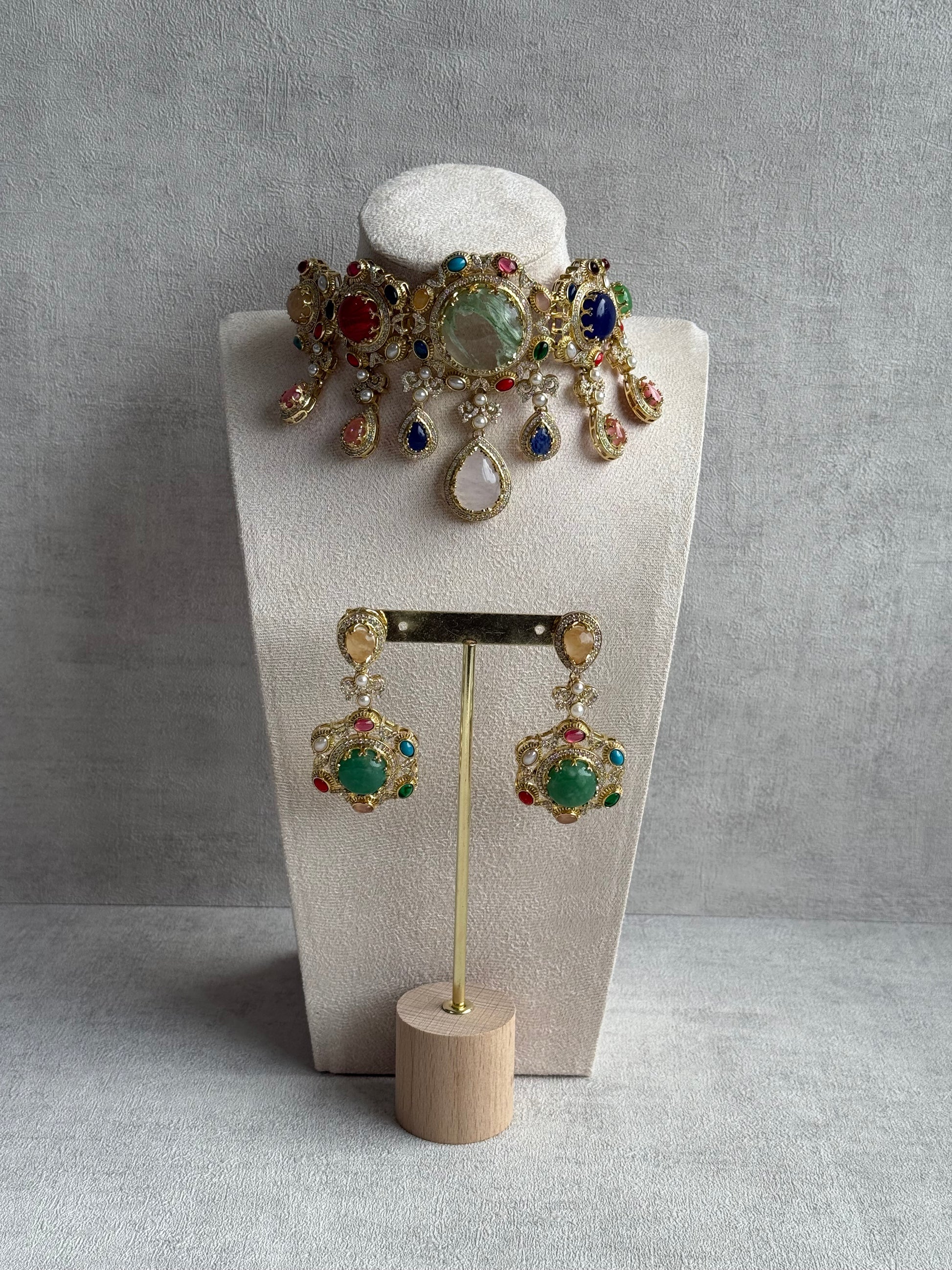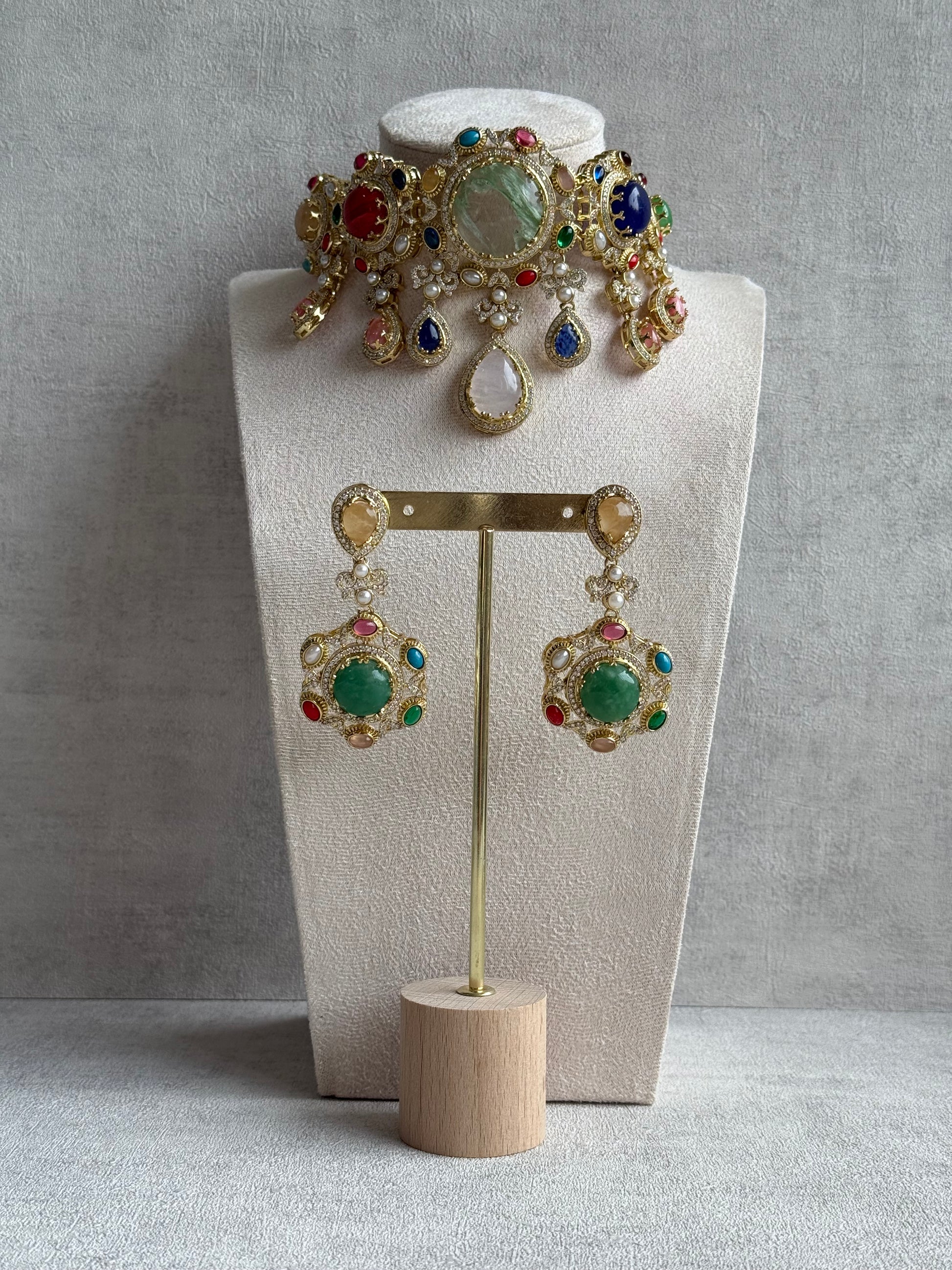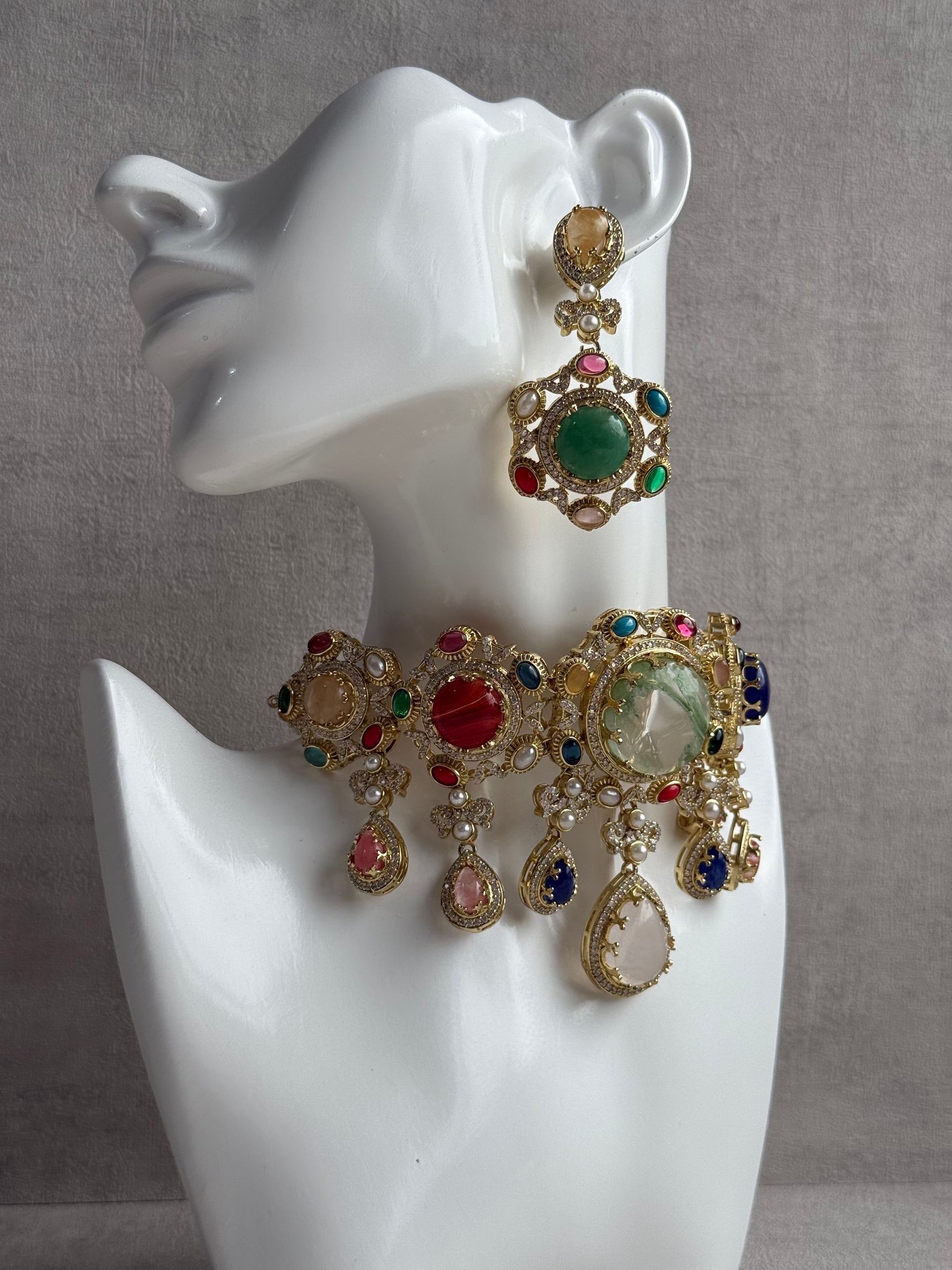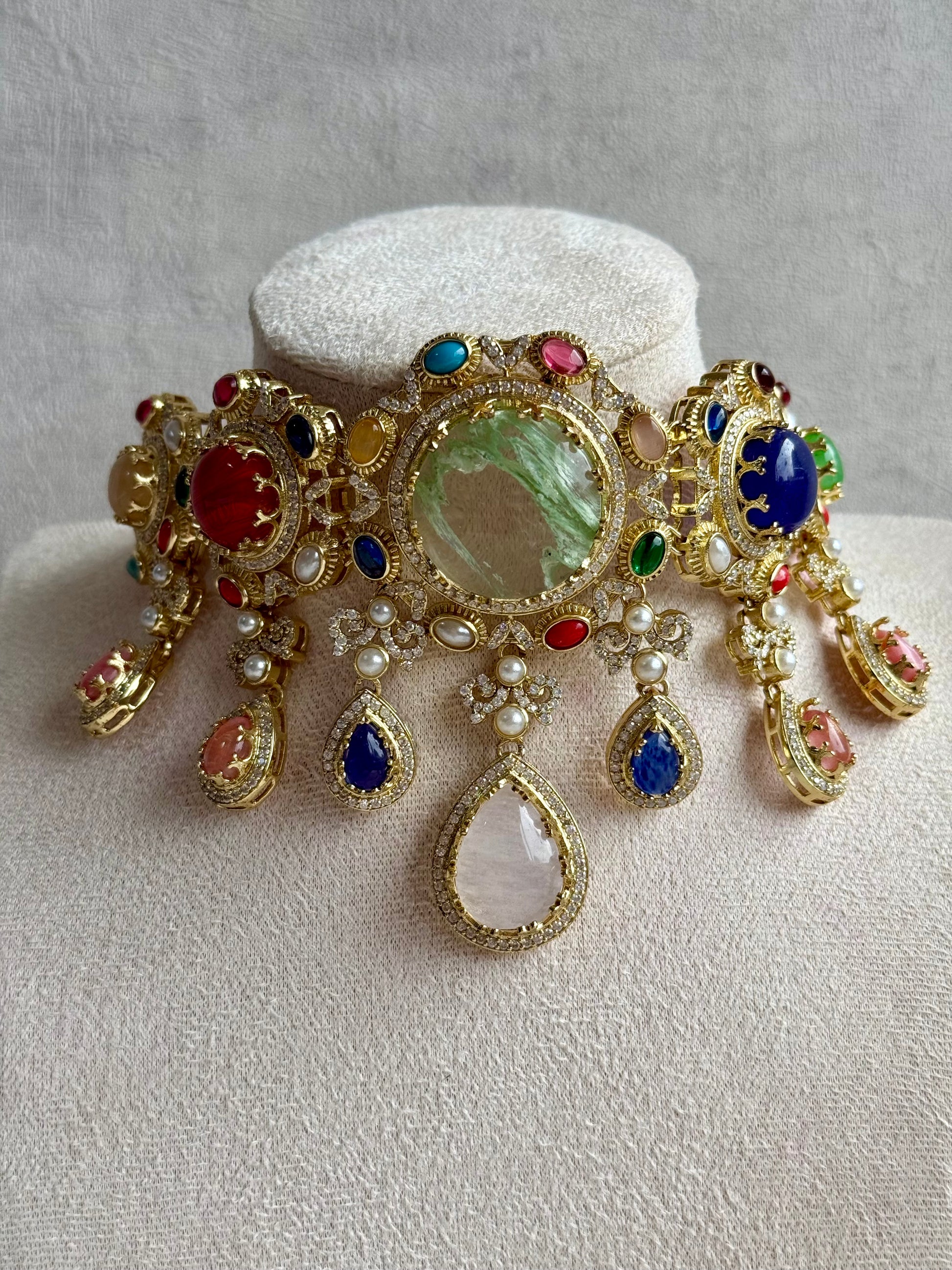 Every element of this choker commands attention — from the radiant cluster of multicoloured stones in hues of emerald, ruby, sapphire, turquoise, and blush pink, to the ornate gold-toned framework adorned with crystal accents. The design is finished with teardrop pearl drops that move gently with every turn, adding elegance to its bold silhouette.