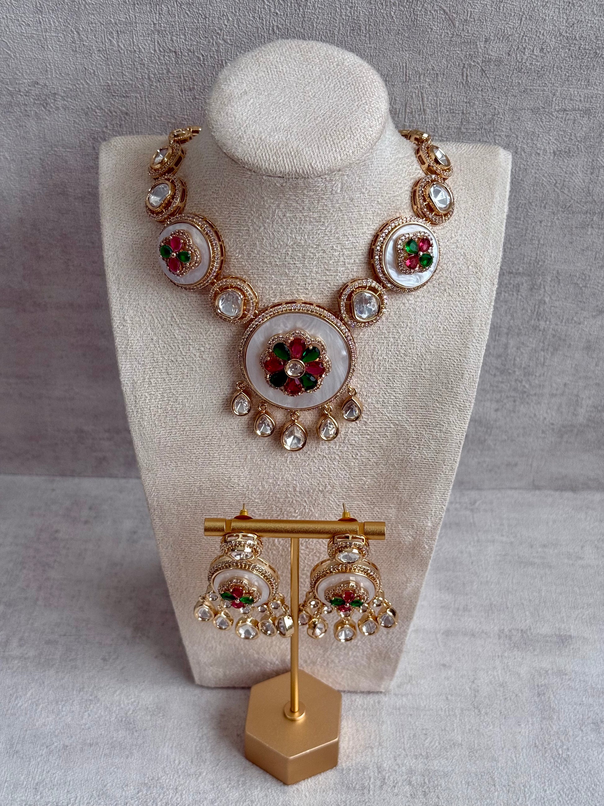 The Ayura Designs Wisah Set – Necklace & Earrings with Mirror-Cut Stones, Fuchsia, Emerald & Mother-of-Pearl Detailing captures the grace of timeless design with a contemporary twist. This radiant set draws inspiration from Mughal floral artistry, reimagined through luminous mother-of-pearl backdrops and jewel-toned contrasts.
