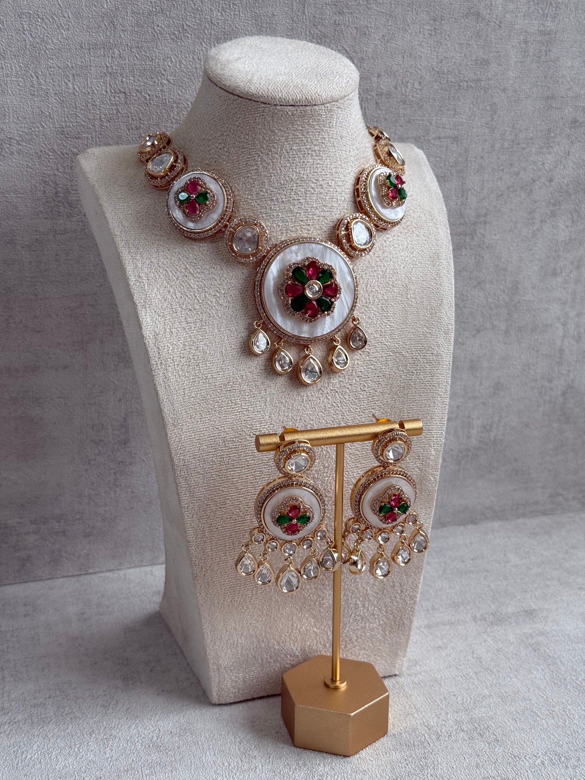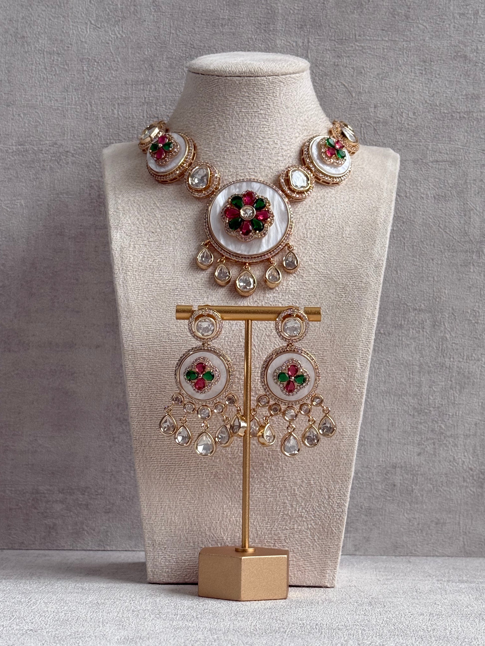 The necklace features large circular motifs with inlaid fuchsia and emerald petals, each framing a mirror-cut centre stone. The reflective ivory base of the mother-of-pearl enhances the brilliance of every jewel, while teardrop-cut crystals cascade delicately along the bottom edge for a graceful finish. The interplay of colours and textures makes this set a true statement piece.