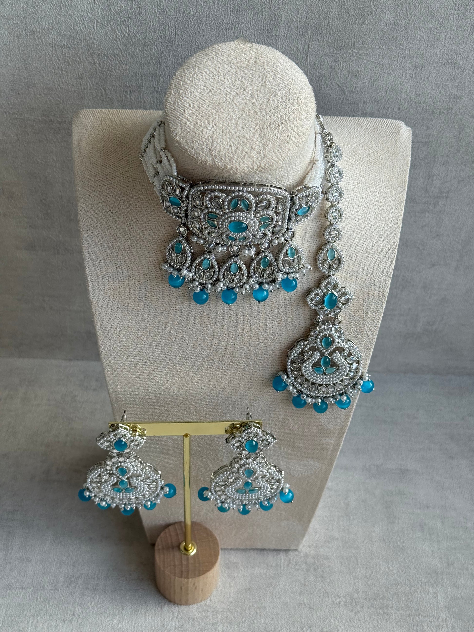 The choker features an intricately detailed centrepiece framed by mirror-cut stones and bordered with dainty pearls, while strands of seed beads wrap gently around the neck for a comfortable yet regal fit. Aqua blue stones and bead drops add a refreshing splash of colour, capturing the tranquil beauty of ocean hues. Matching statement earrings and a delicate tikka complete the set, echoing the same artistry and balance.
