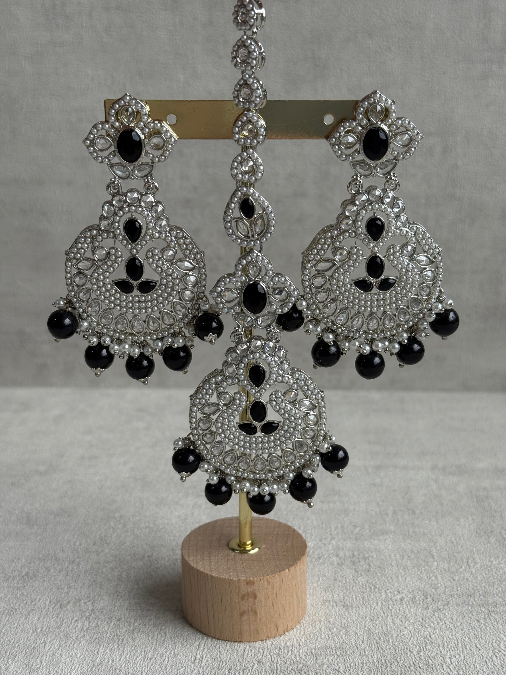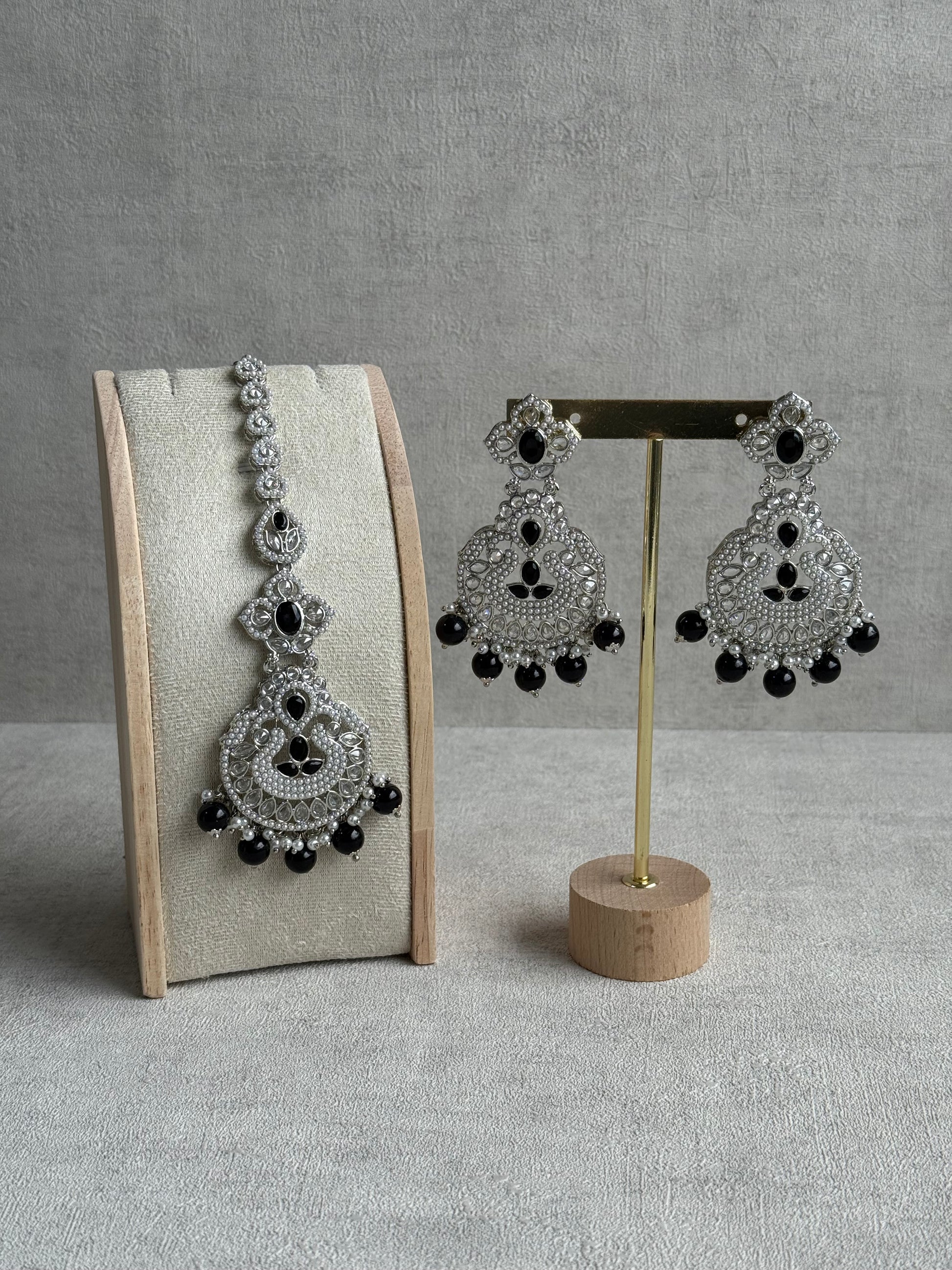 The coordinating earrings echo the same intricate artistry — featuring a regal chandelier silhouette enriched with pearl embellishments and black bead accents. A matching tikka completes the trio, tying the look together with poise and radiance.