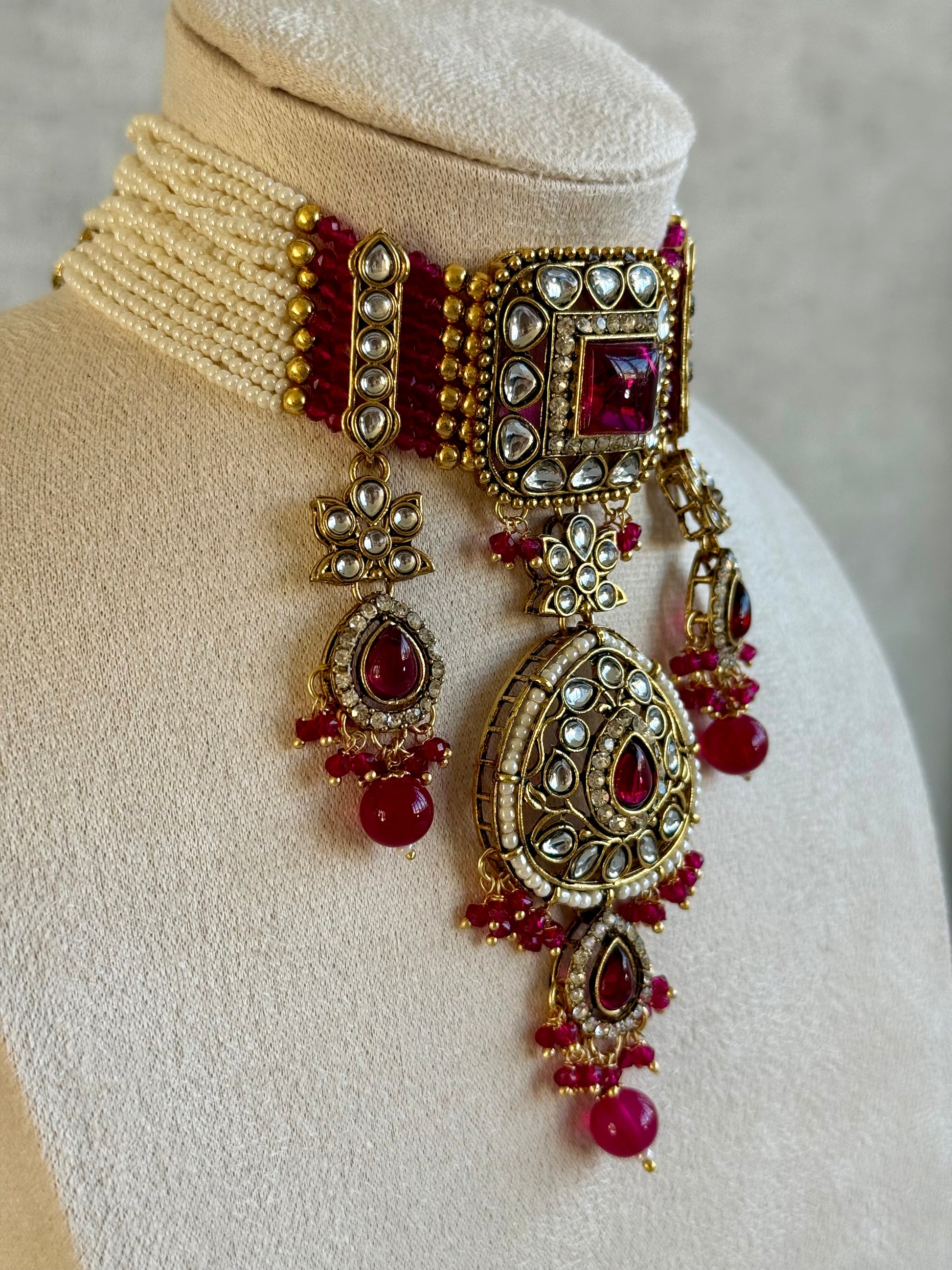 Ayura Designs Zarmeen Choker Set with Earrings & Tikka – Mirror-Cut Stones, Antique Gold Finish and Fuchsia Beads