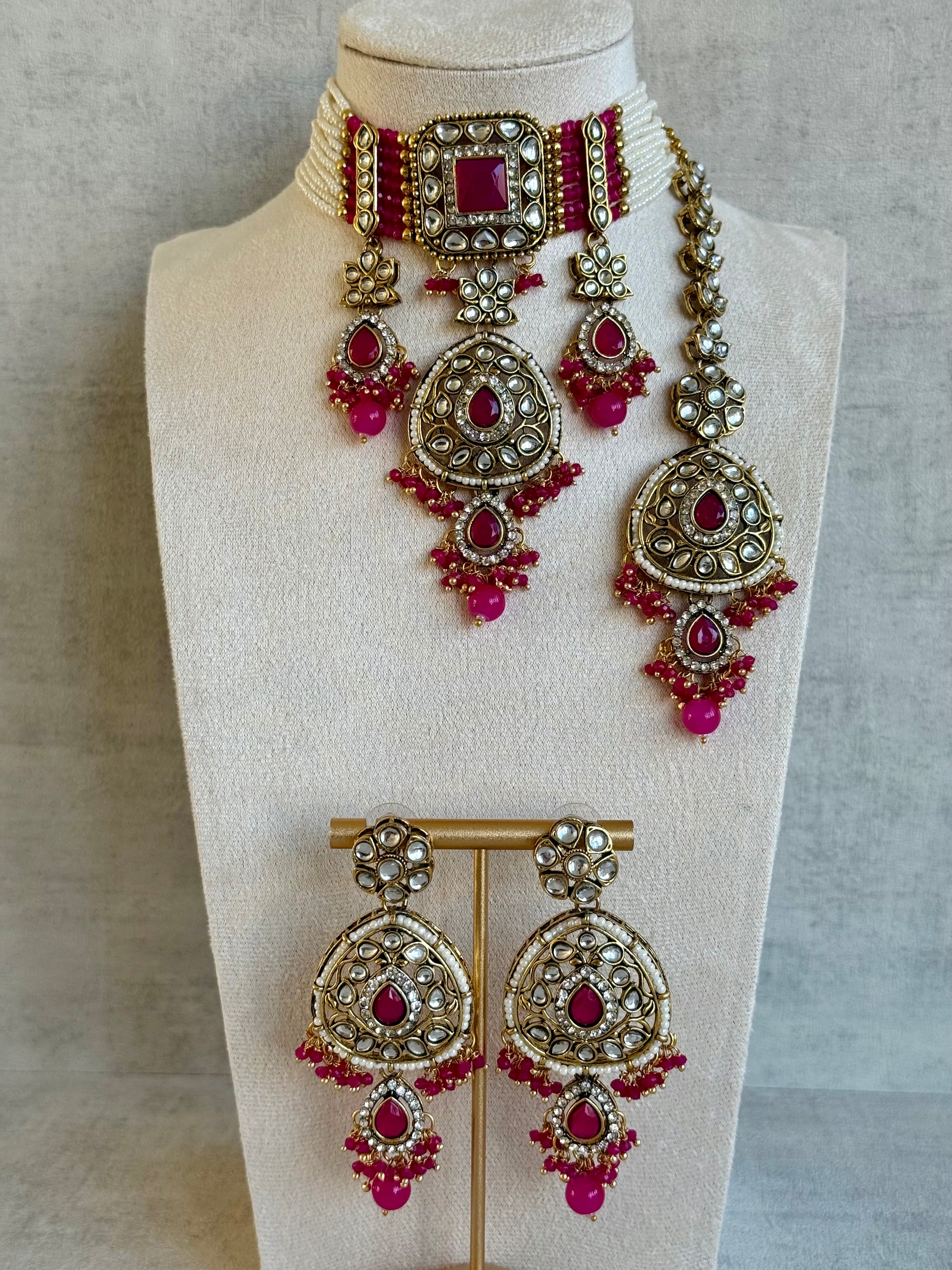 The choker features layered pearl strands, detailed side panels, and a square centrepiece enriched with bright pink accents. Matching earrings and tikka complete the look with perfect symmetry.