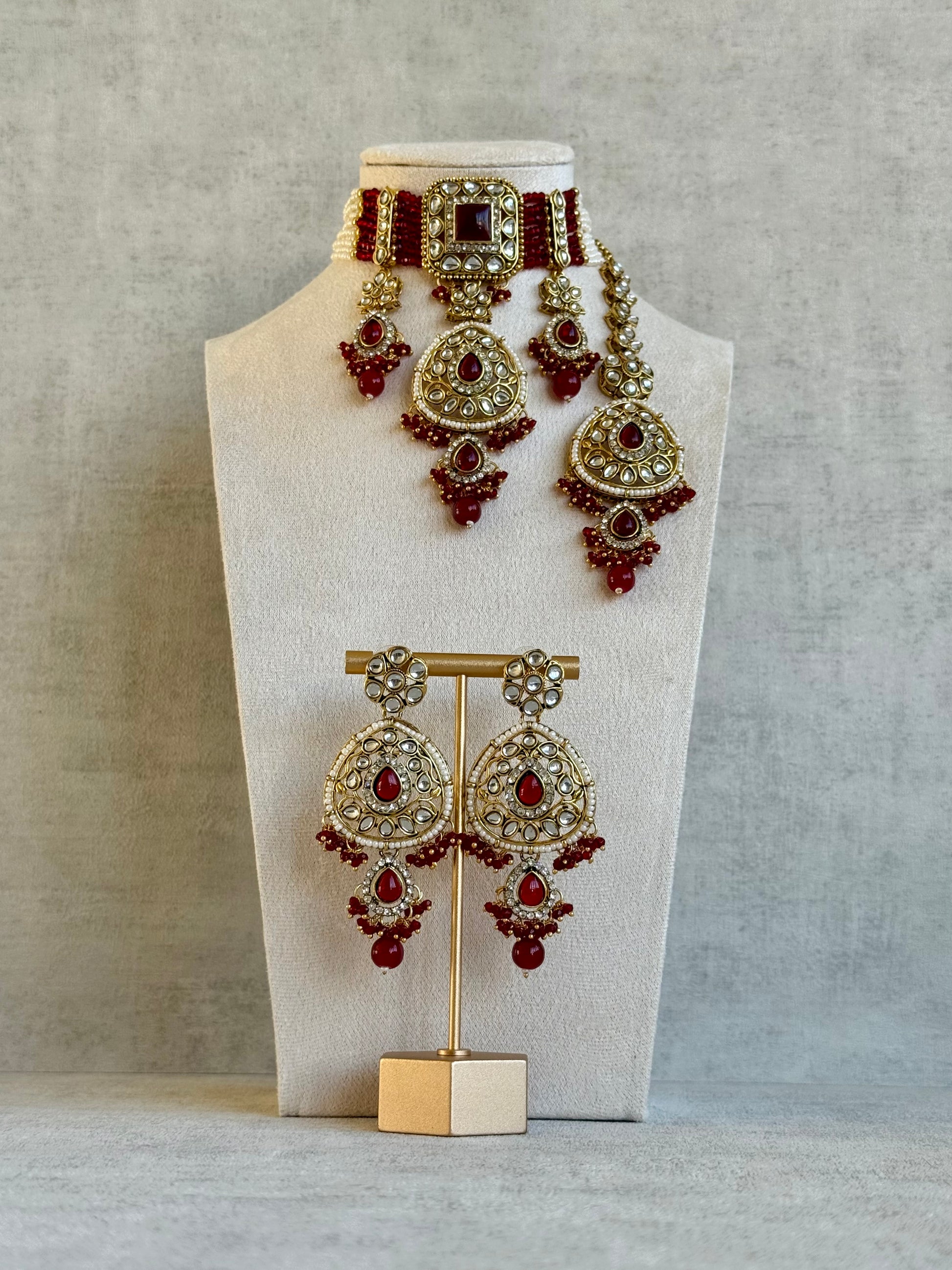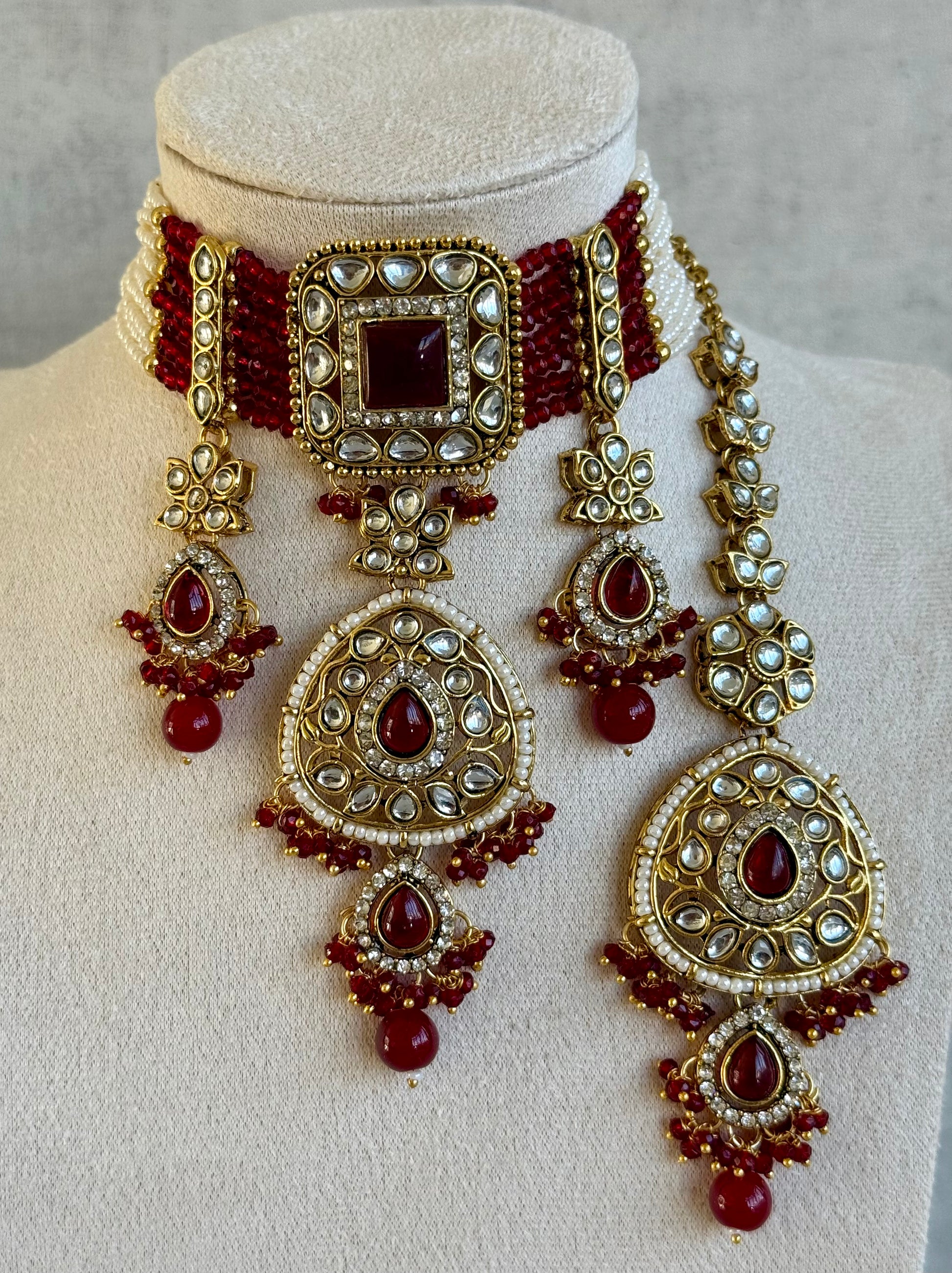 Ayura Designs Zarmeen Choker Set with Earrings & Tikka – Mirror-Cut Stones, Antique Gold Finish and Ruby Red Beads