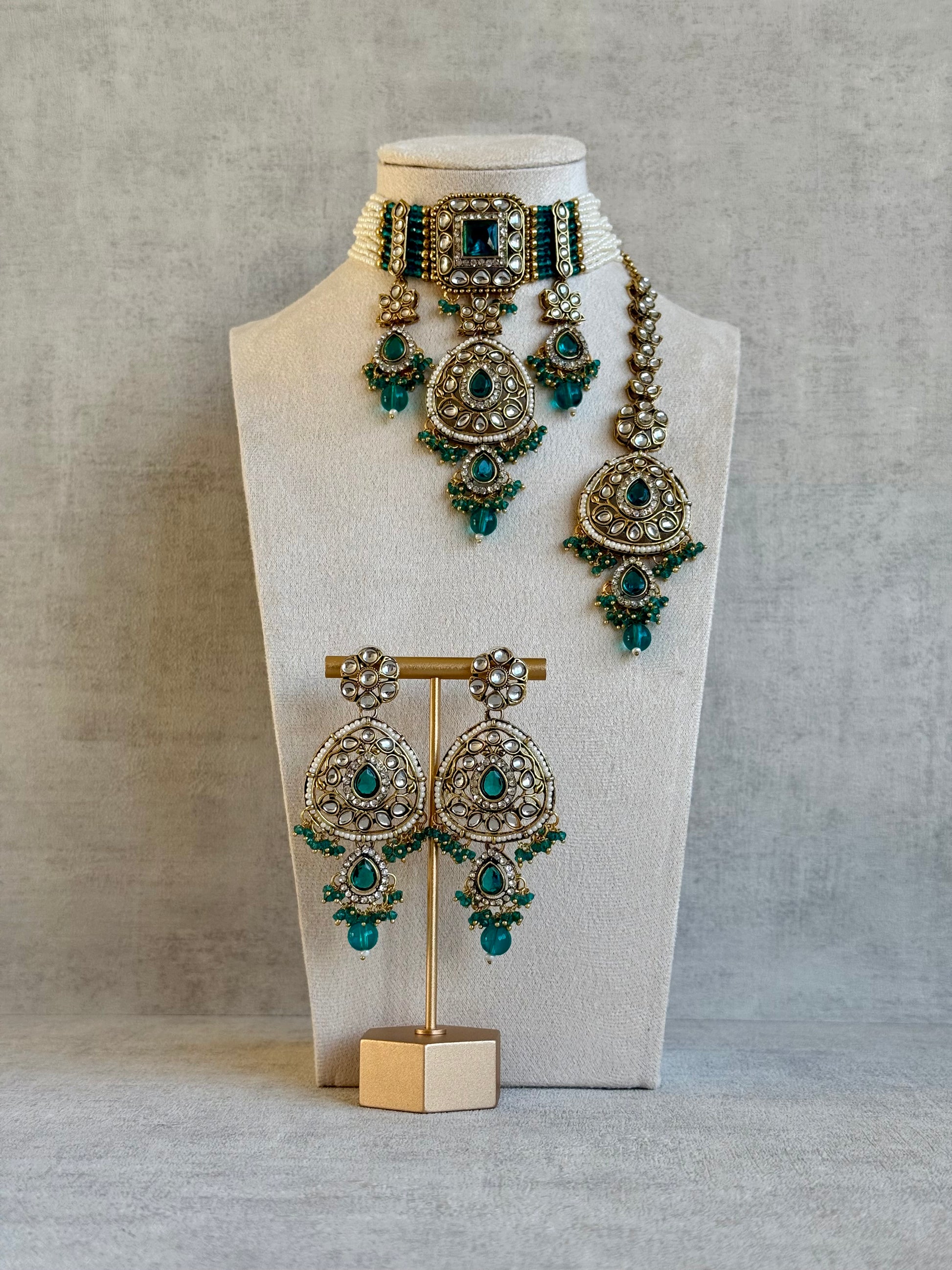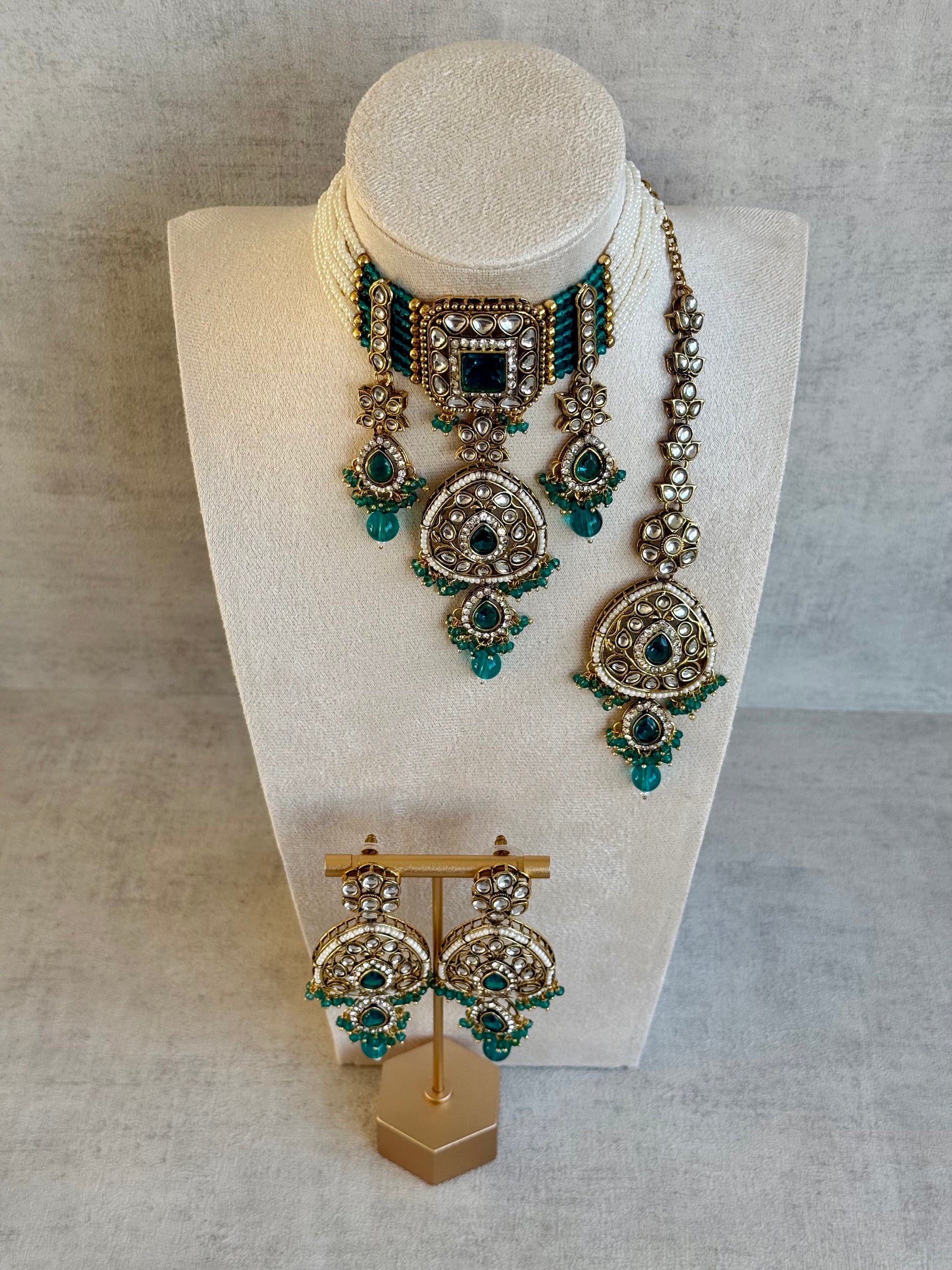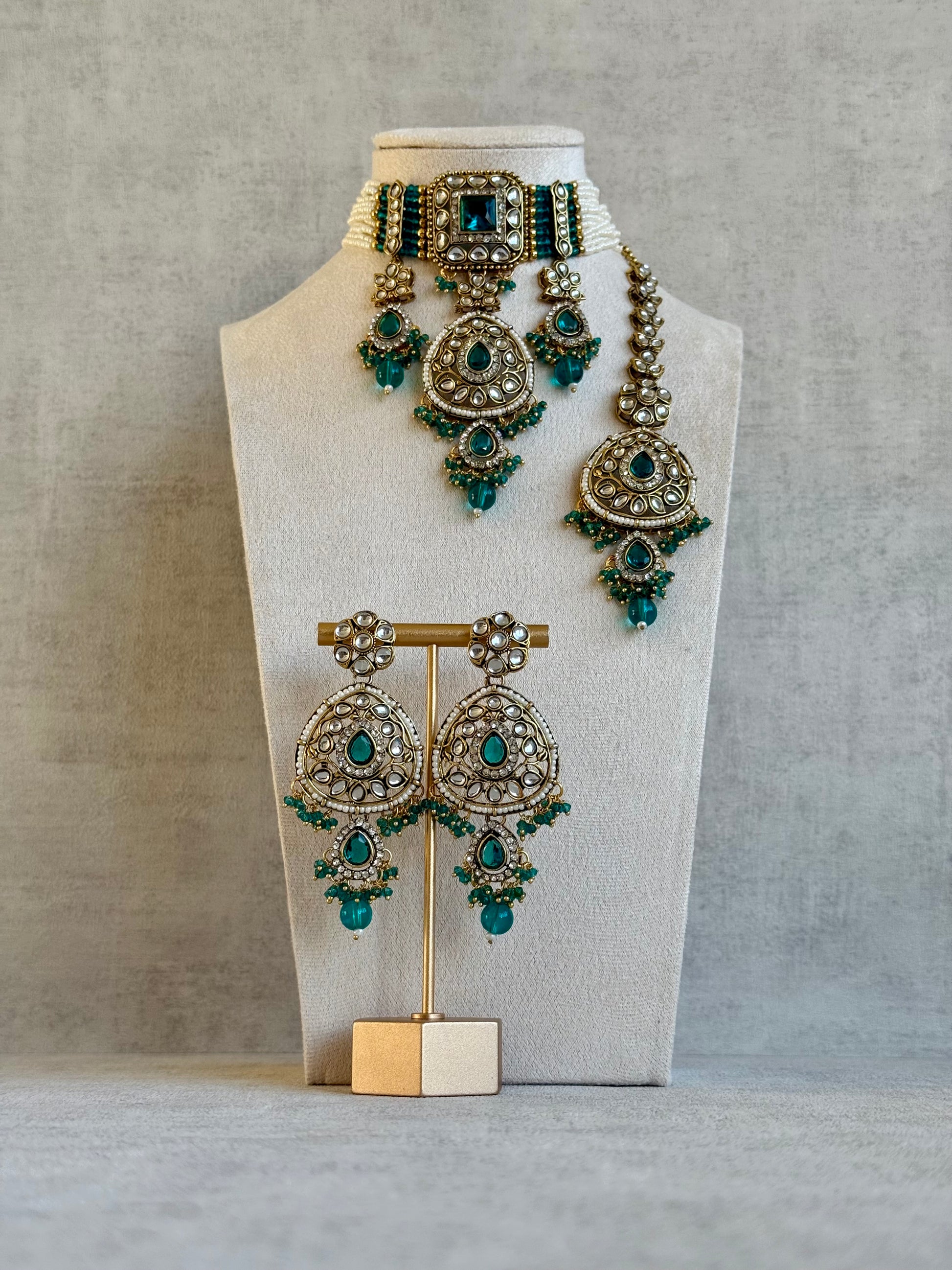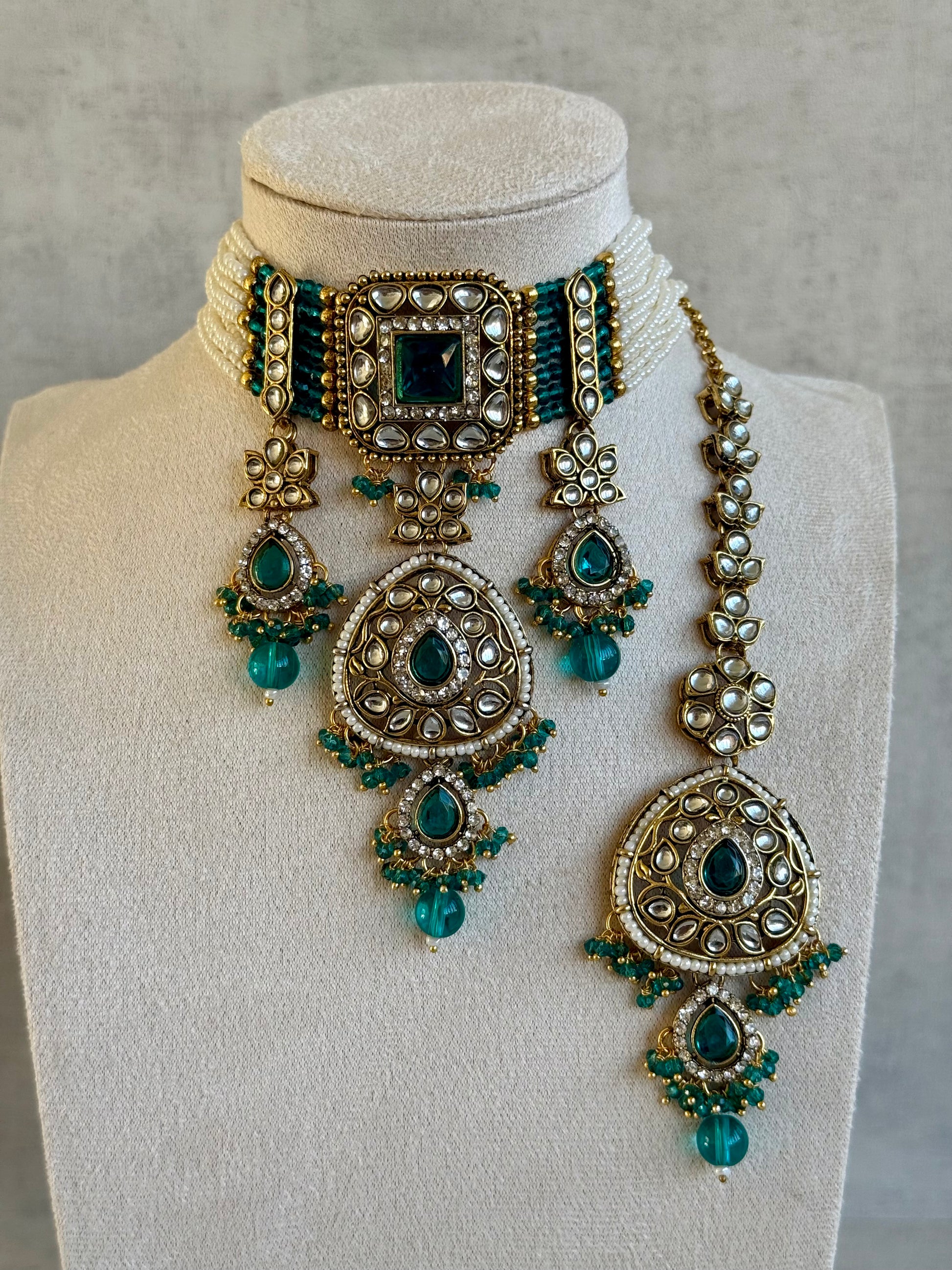 Ayura Designs Zarmeen Choker Set with Earrings & Tikka – Mirror-Cut Stones, Antique Gold Finish and Teal Green Beads