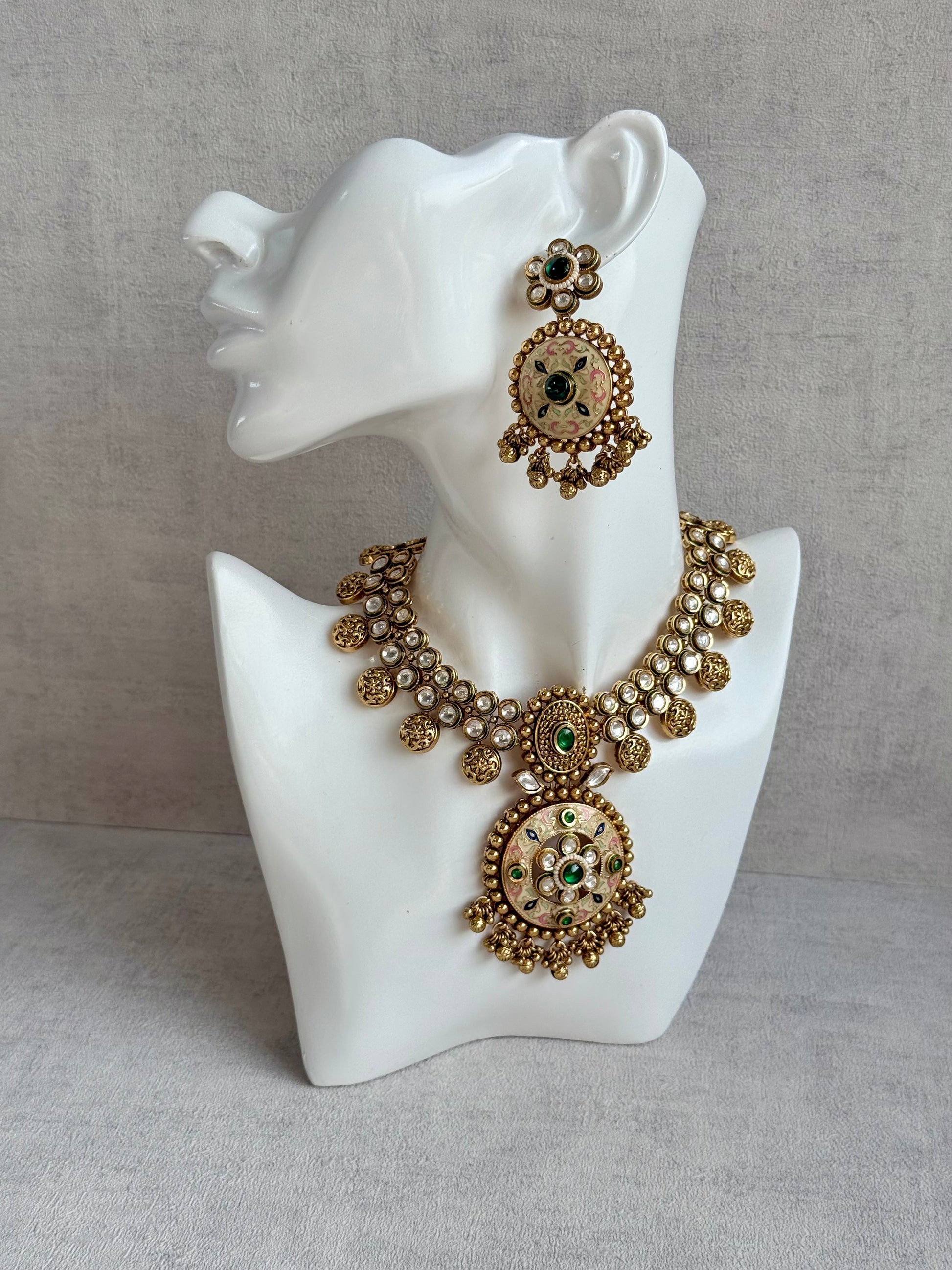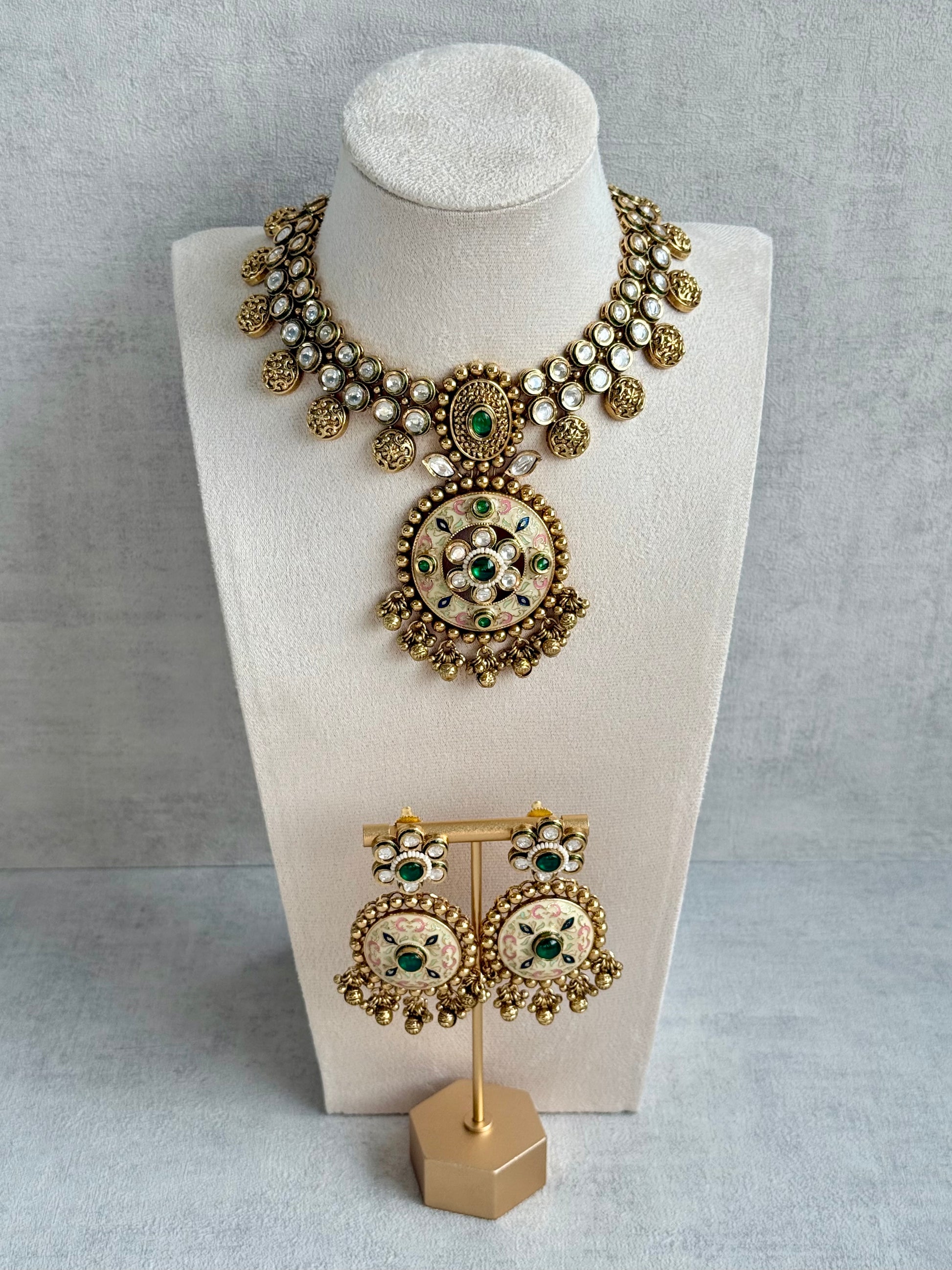 At the heart of the necklace sits a bold circular pendant with a deep emerald green centre, surrounded by mirror cut stones and framed with ornate meenakari work. The upper row of kundan style stones and gold medallion drops adds depth and dimension, creating a statement necklace that feels both elegant and powerful.