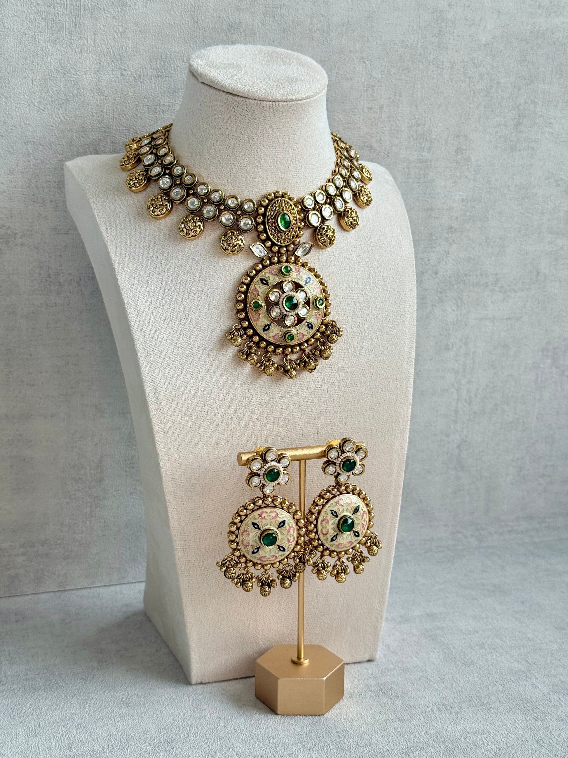 The Zayna Set in Ivory Meenakari with Emerald Green stones offers a rich, heritage inspired take on this beautifully detailed design. The creamy ivory enamel is decorated with delicate pink and blue hand painted motifs, highlighted by antique gold textures that give the set a truly traditional feel.