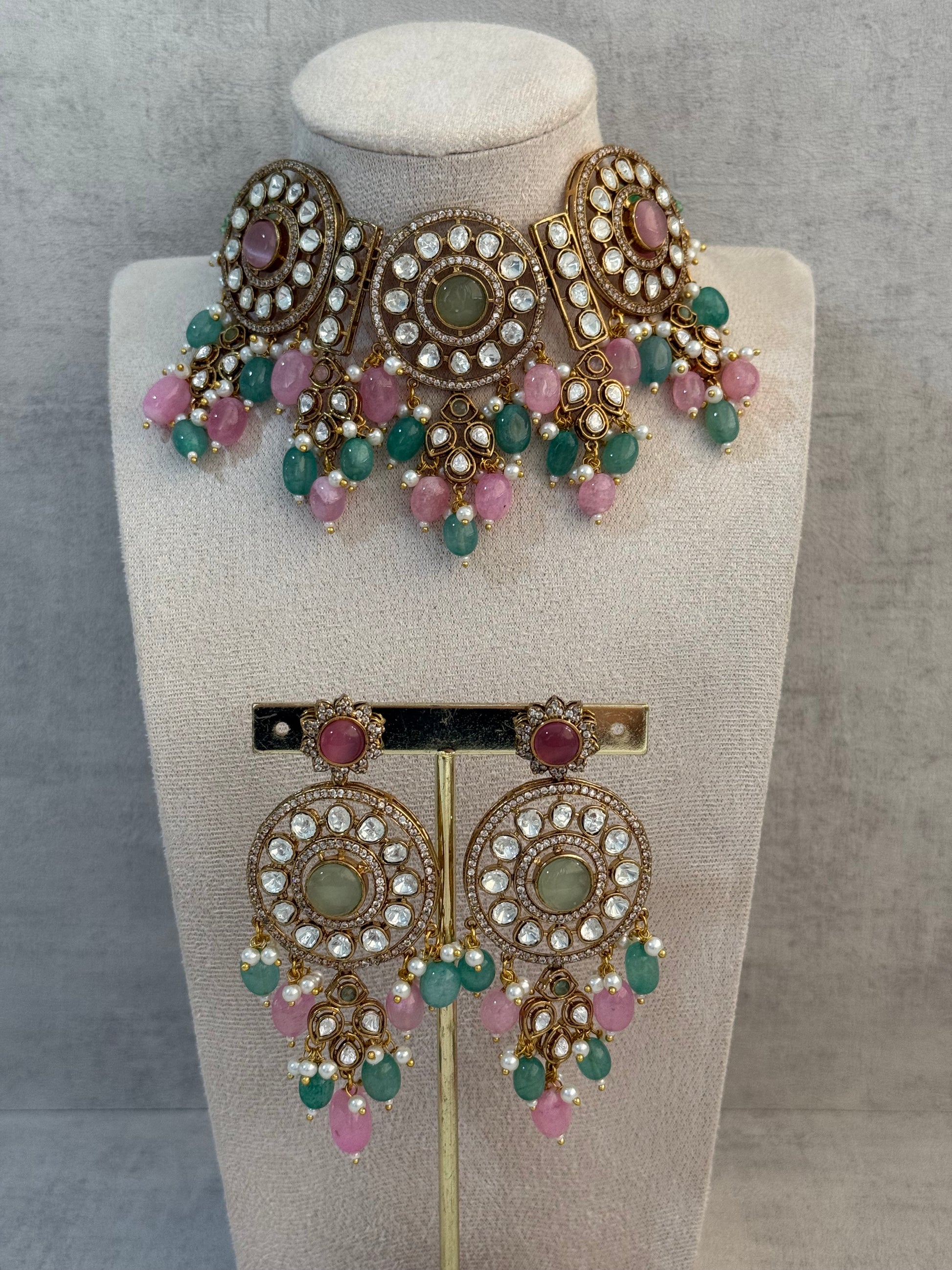 The choker features three bold circular motifs adorned with rows of gleaming kundan stones, each centred with pastel-toned cabochon gems in blush and mint. Suspended below are clusters of oval-cut beads in matching hues, accentuated with delicate pearls that shimmer softly against the antique gold finish. Every bead and stone has been thoughtfully arranged to create movement, depth, and timeless allure.