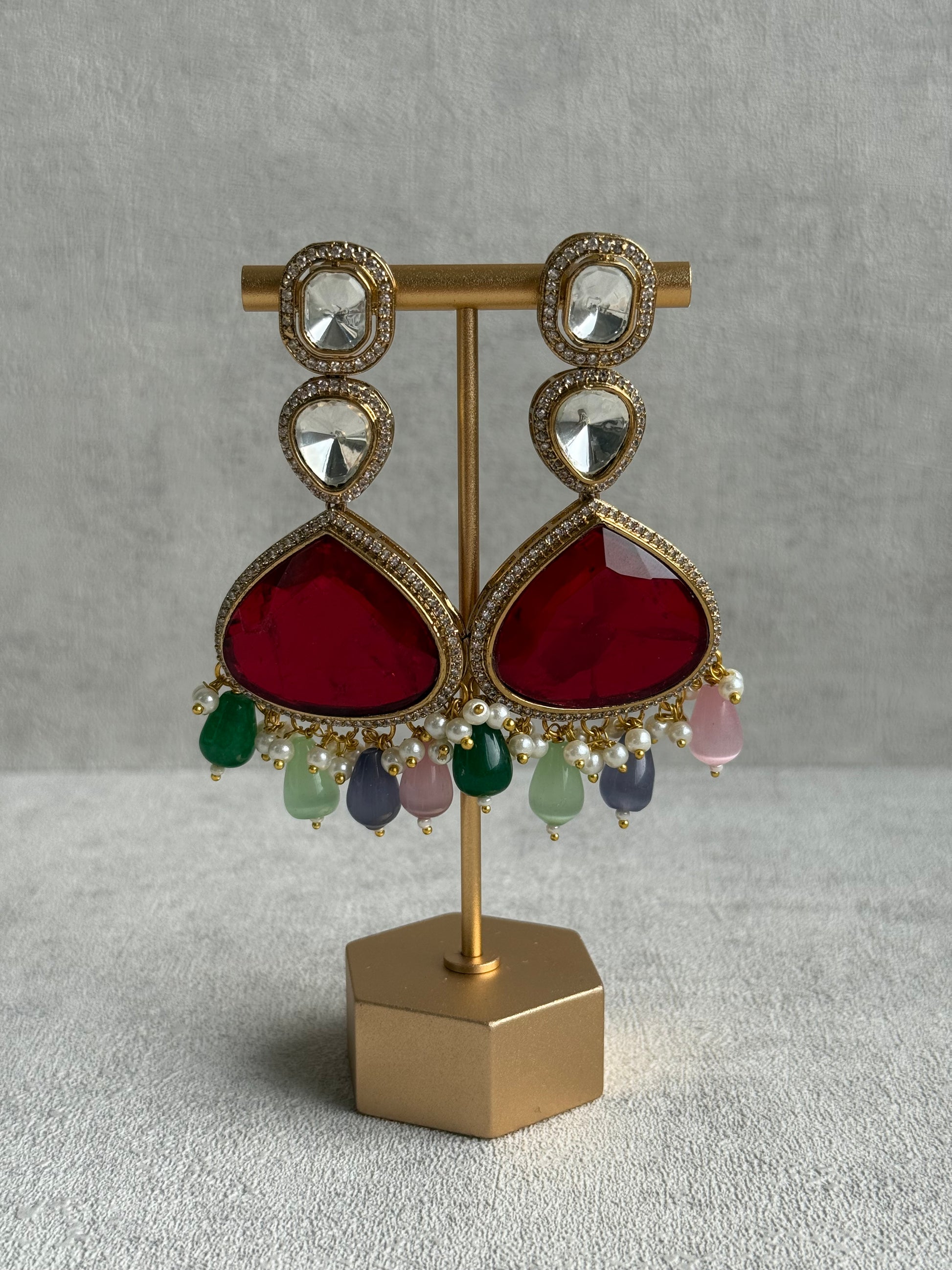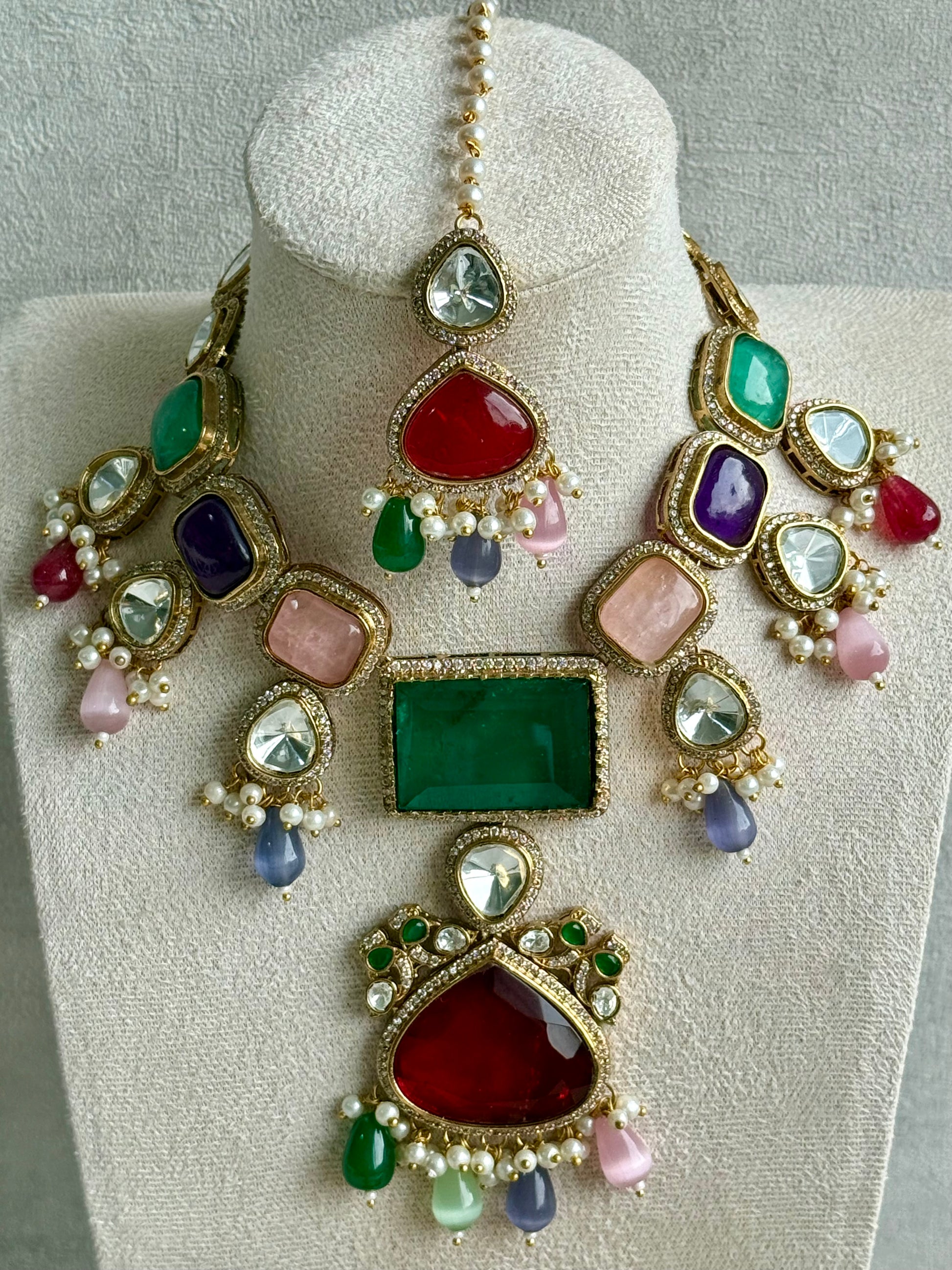The necklace is a vision of regal artistry — featuring striking square, teardrop, and oval-cut stones in ruby red, emerald green, lilac, blush pink, and icy mirror-cut white. Each gem is bordered with shimmering crystals and finished with pearl and pastel bead drops that sway delicately with every movement. The rectangular emerald centrepiece anchors the design, exuding a refined, heirloom quality.