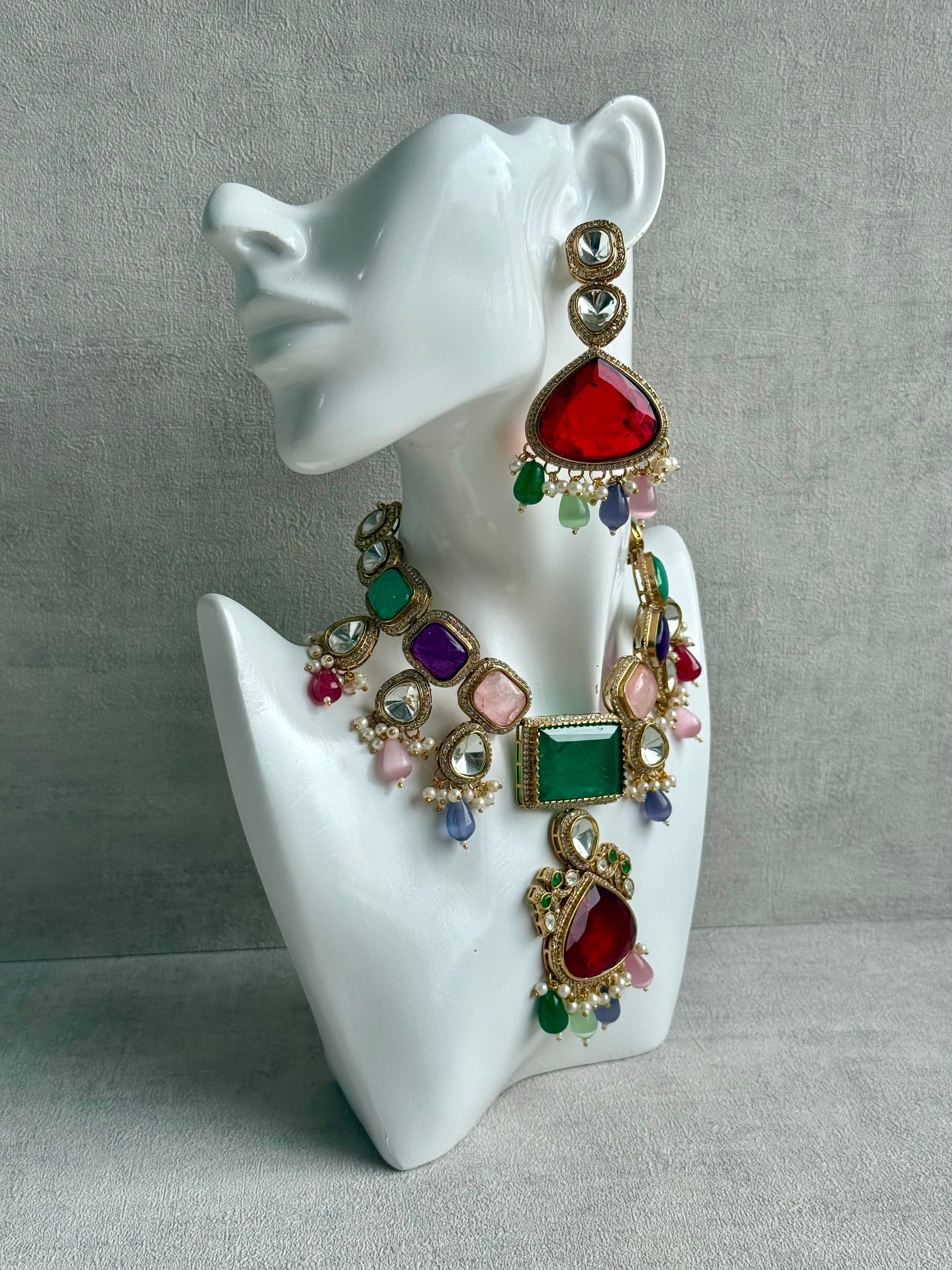 The matching earrings and tikka mirror the same bold geometry and multicolour palette, highlighted by deep ruby focal stones surrounded by mirror-cut and pastel detailing. Together, the trio forms a coordinated statement look — vibrant, regal, and full of personality.